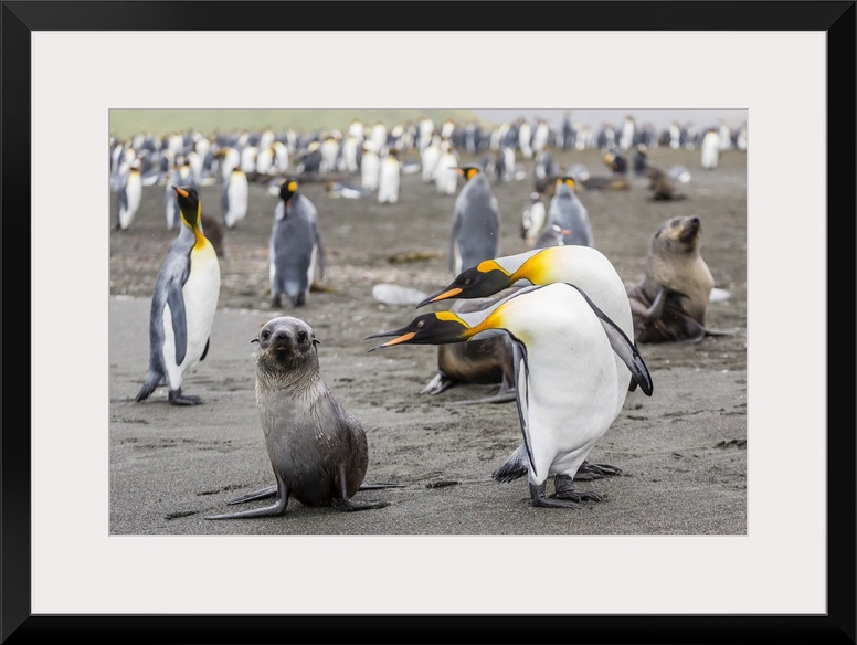 <p>Antarctic fur seal (Arctocephalus gazella) pup with king penguins, Gold Harbour, South Georgia, South Atlantic Ocean, Polar Regions</p>