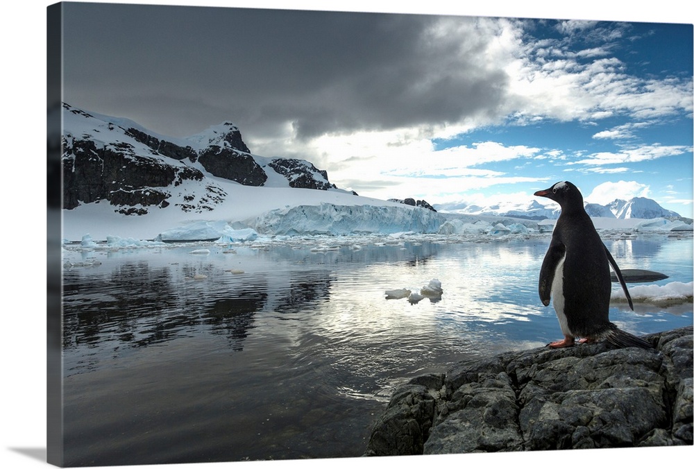 <p>Antarctica, Cuverville Island, Silhouette of Gentoo Penguin (Pygoscelis papua) standing on rocky shoreline along Errera Channel.</p>