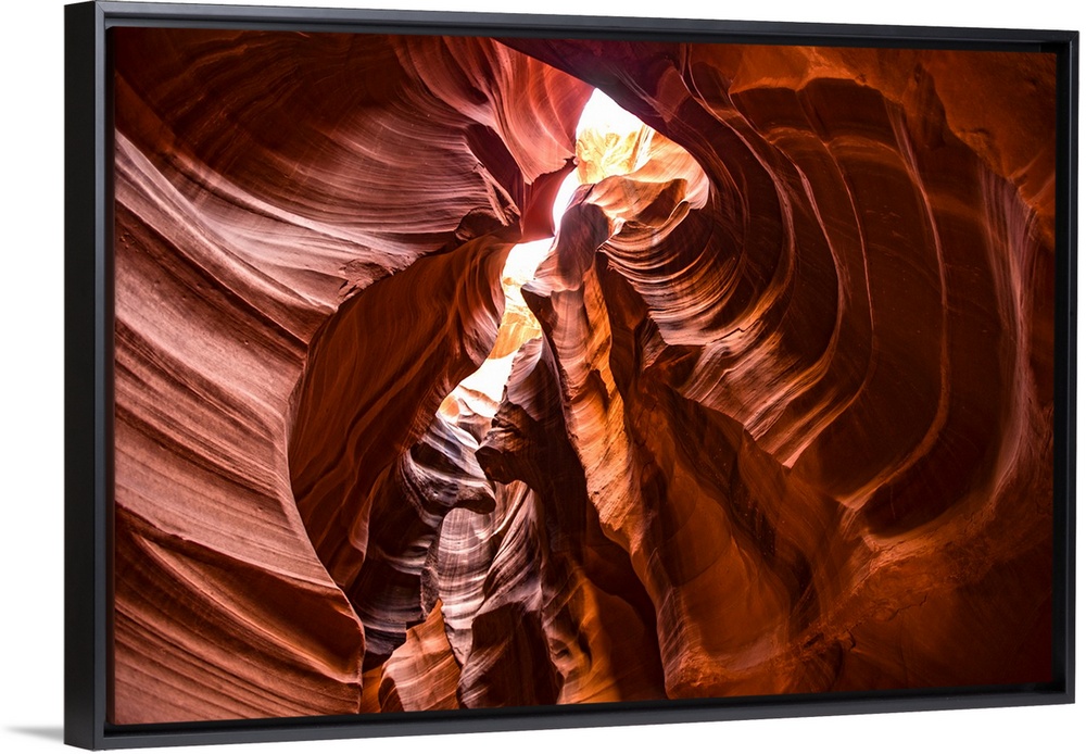 <p>Photograph from inside of Antelope Canyon rock formation located on the Navajo Reservation in Page, Arizona with flowing pointed textures and light beaming through the top.</p>