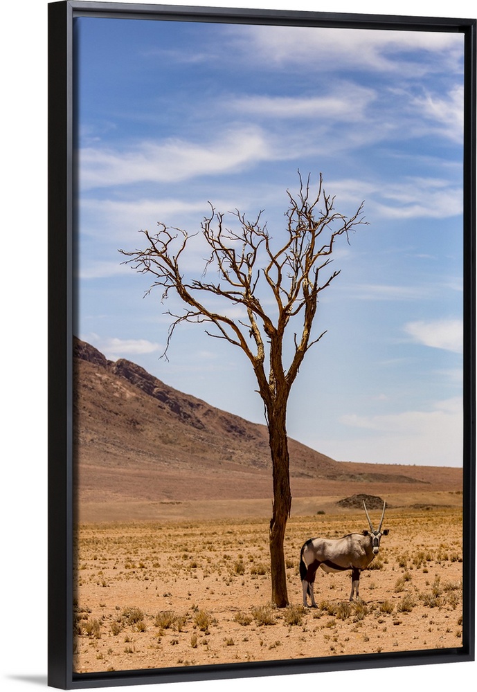 <p>An antelope stands under a tree in the desert; Sossusvlei, Hardap Region, Namibia</p>