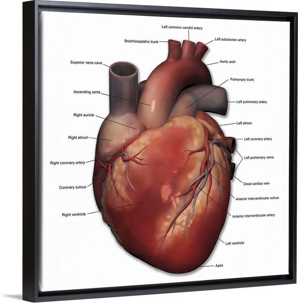 <p>Anterior view of human heart anatomy with annotations.</p>