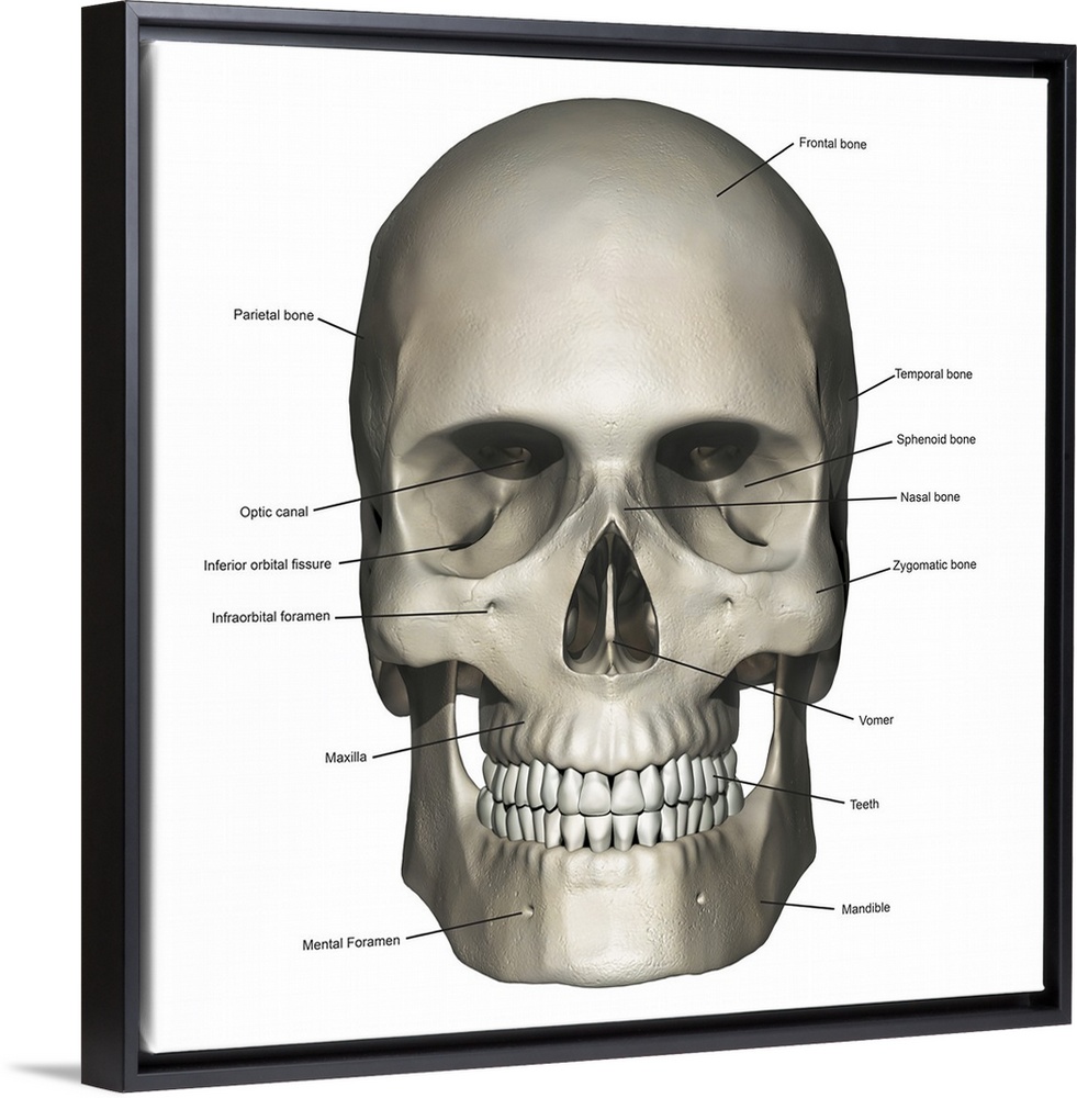 <p>Anterior view of human skull anatomy with annotations.</p>