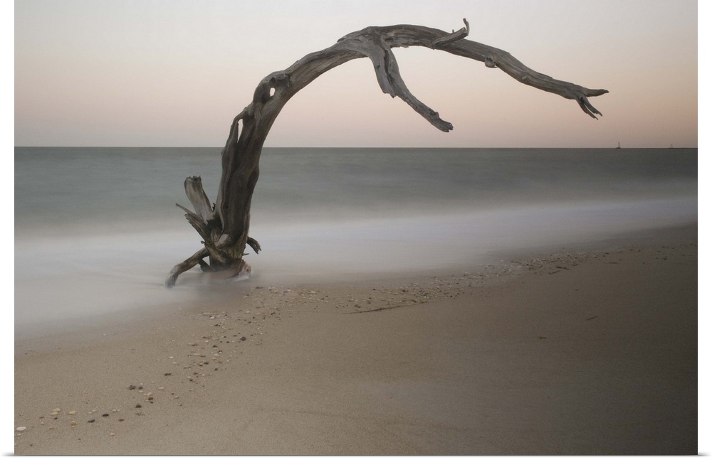 <p>A photograph of piece of driftwood sticking up out of the sand on a beach.</p>