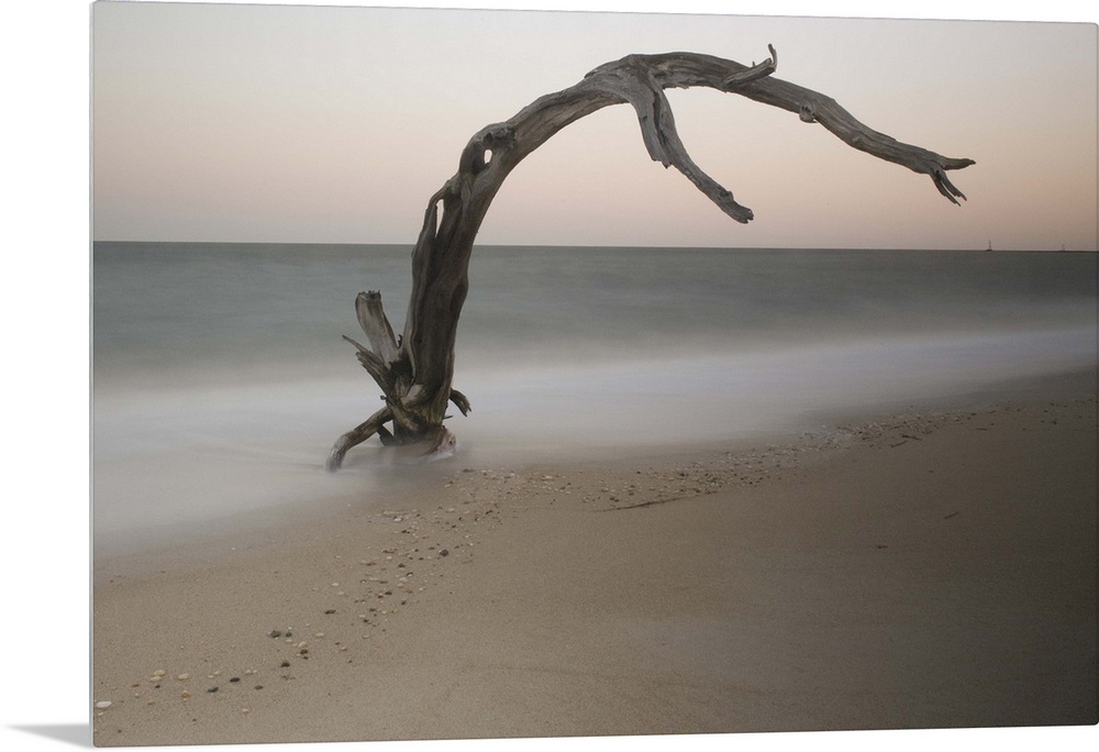 <p>A photograph of piece of driftwood sticking up out of the sand on a beach.</p>