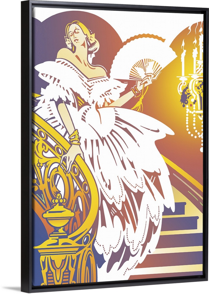 <p>Vintage-style illustration of a woman in an extravagant evening gown with a fan.</p>