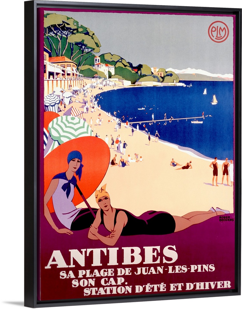 <p>This vintage poster has two women in bathing suits showcased in the foreground with a beach full of people and beach umbrellas in the background with sail boats in the water.</p>