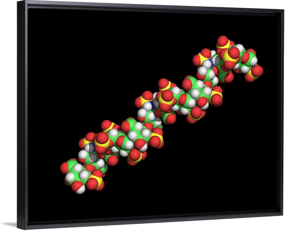 <p>Anticoagulant molecule. Computer model of the anticoagulant heparin. Atoms are represented as spheres and are colour-coded: carbon (green), hydrogen (white), oxygen (red), nitrogen (blue) and sulphur (yellow). Heparin is a polysaccharide (sugar) molecule found naturally in the human body. It is in greatest concentration in tissues surrounding the capillaries of the liver and lungs, where it inhibits the formation of blood clots. Heparin is made synthetically as a drug to prevent thrombosis and embolism in patients with vascular diseases. It is also used during open- heart surgery, heart bypass surgery and kidney dialysis, to prevent clotting.</p>