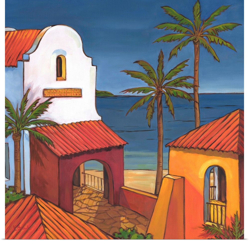 <p>Painting of adobe buildings and palm trees in Antigua, looking out to the sea.</p>