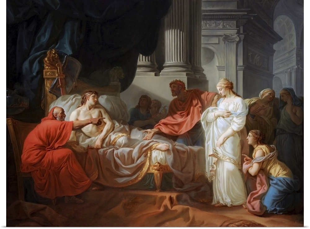 <p>Vintage painting of Antiochus ill in bed as his doctor, Erasistratus, discovers his love for his new mother Stratonice of Syria is the cause of his illness. The painting is titled: Erasistratus Discovering the Cause of Antiochus' Disease, by Jacques-Louis David, 1774.</p>