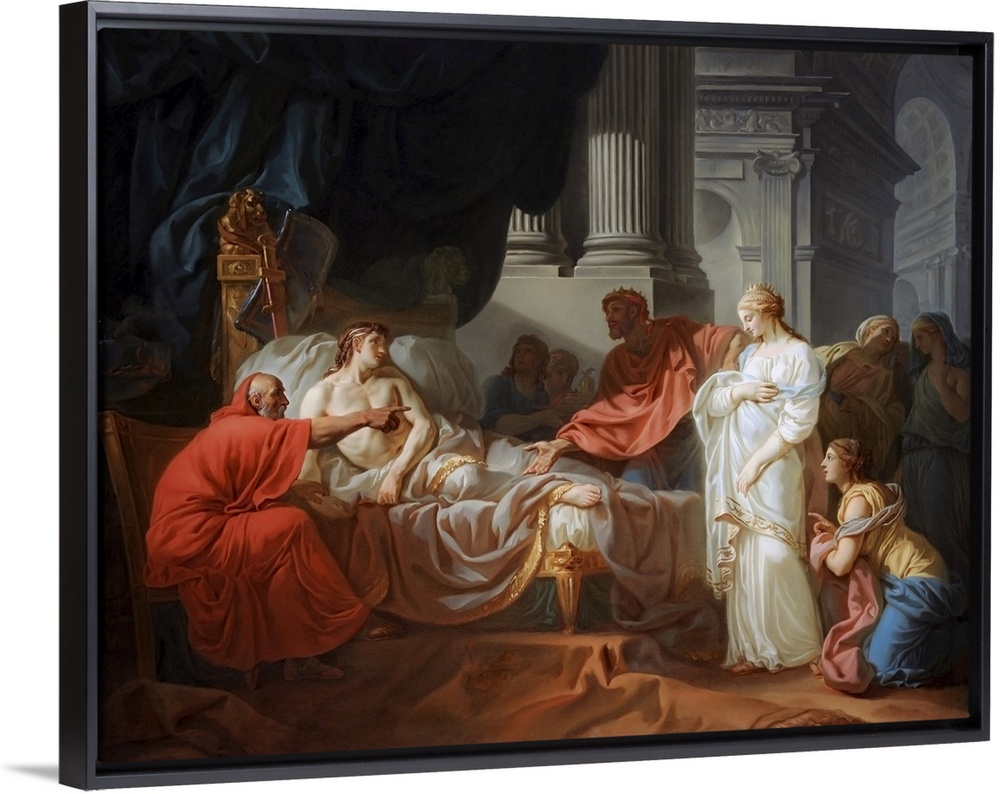 <p>Vintage painting of Antiochus ill in bed as his doctor, Erasistratus, discovers his love for his new mother Stratonice of Syria is the cause of his illness. The painting is titled: Erasistratus Discovering the Cause of Antiochus' Disease, by Jacques-Louis David, 1774.</p>