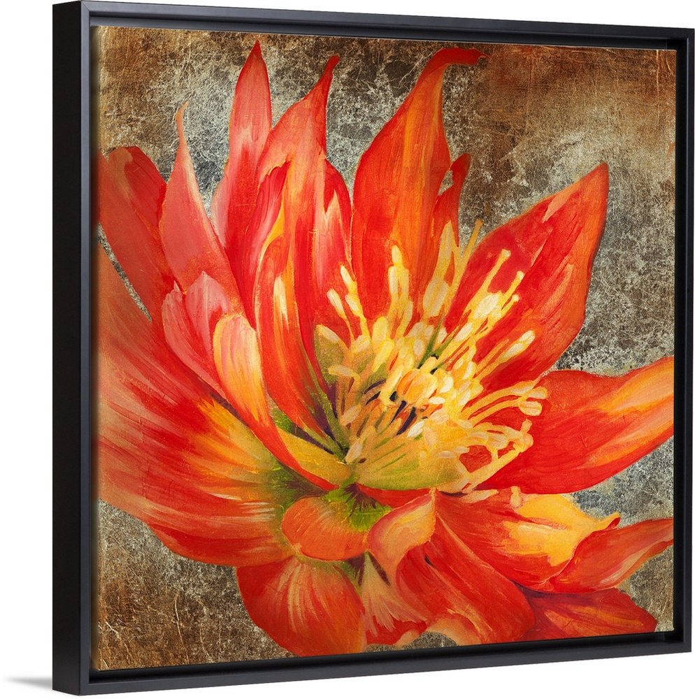 <p>Square artwork of a large red flower with yellow details on a metallic bronze background.</p>