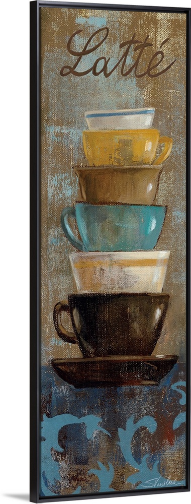 <p>Vertical panoramic artwork of tea different colored and different sized tea cups stacked on top of each other with the text "Latte" at the top.</p>