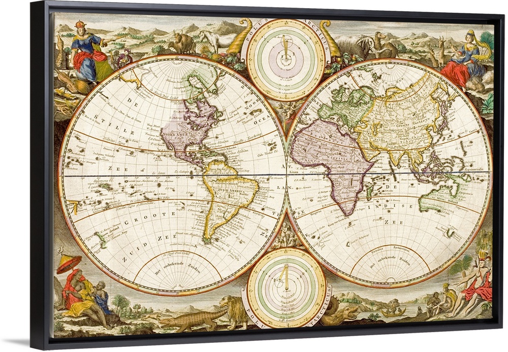 <p>Antique drawing of the globe. Vintage map with distorted continents and mythical illustrations in the corners. Two smaller insets diagramming the poles and latitude lines are found in the center.</p>