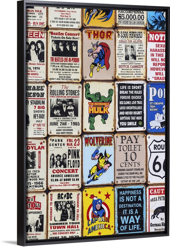 <p>Souvenir metal signs for sale in London, featuring superheroes, sarcastic sayings, and popular music artists.</p>