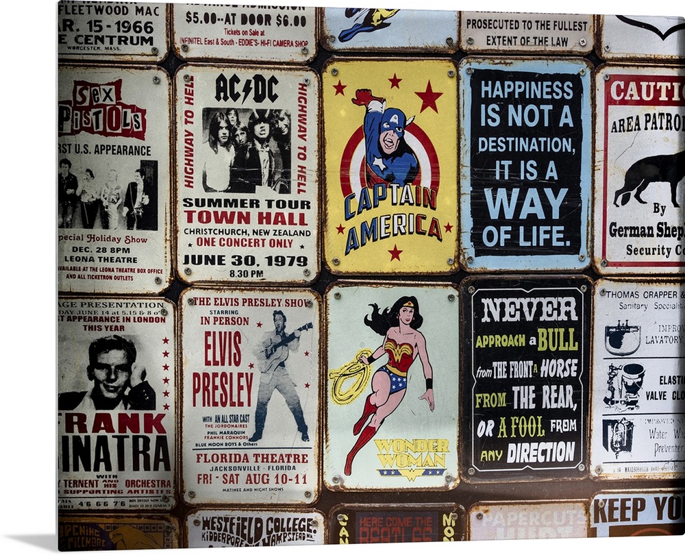 <p>Souvenir metal signs for sale in London, featuring superheroes, sarcastic sayings, and popular music artists.</p>