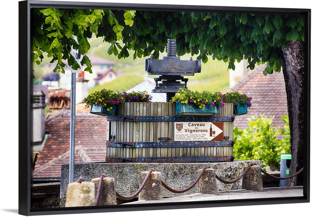 <p>A photograph of a vintage grape press at a vineyard.</p>