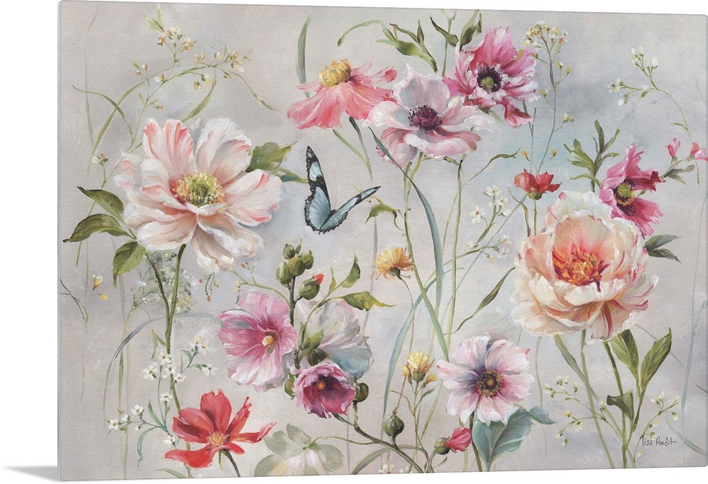 Art Traditional Lisa Audit Plants and Flowers Decorative Art Florals Wildflowers Painting Pink Wall Art Watercolor Insect and Arachnid Butterfly