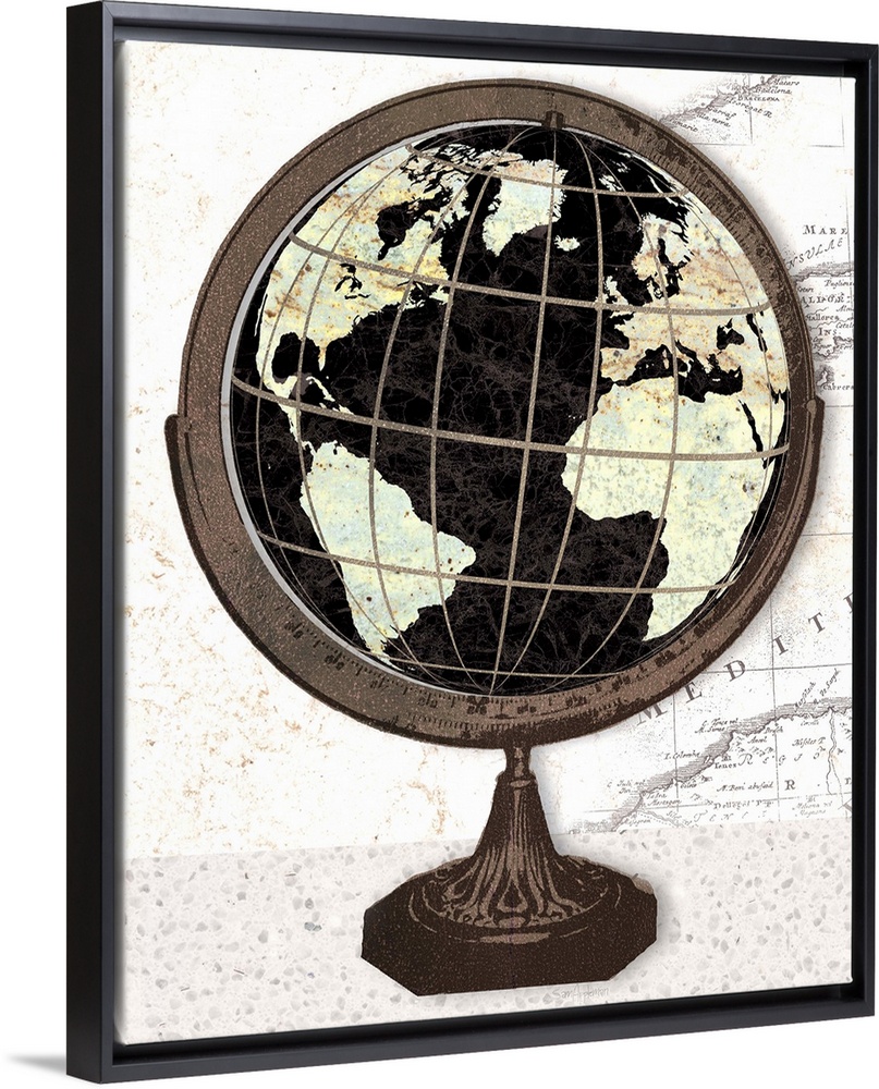 <p>Artwork of an antique old world globe, against a map print background.</p>