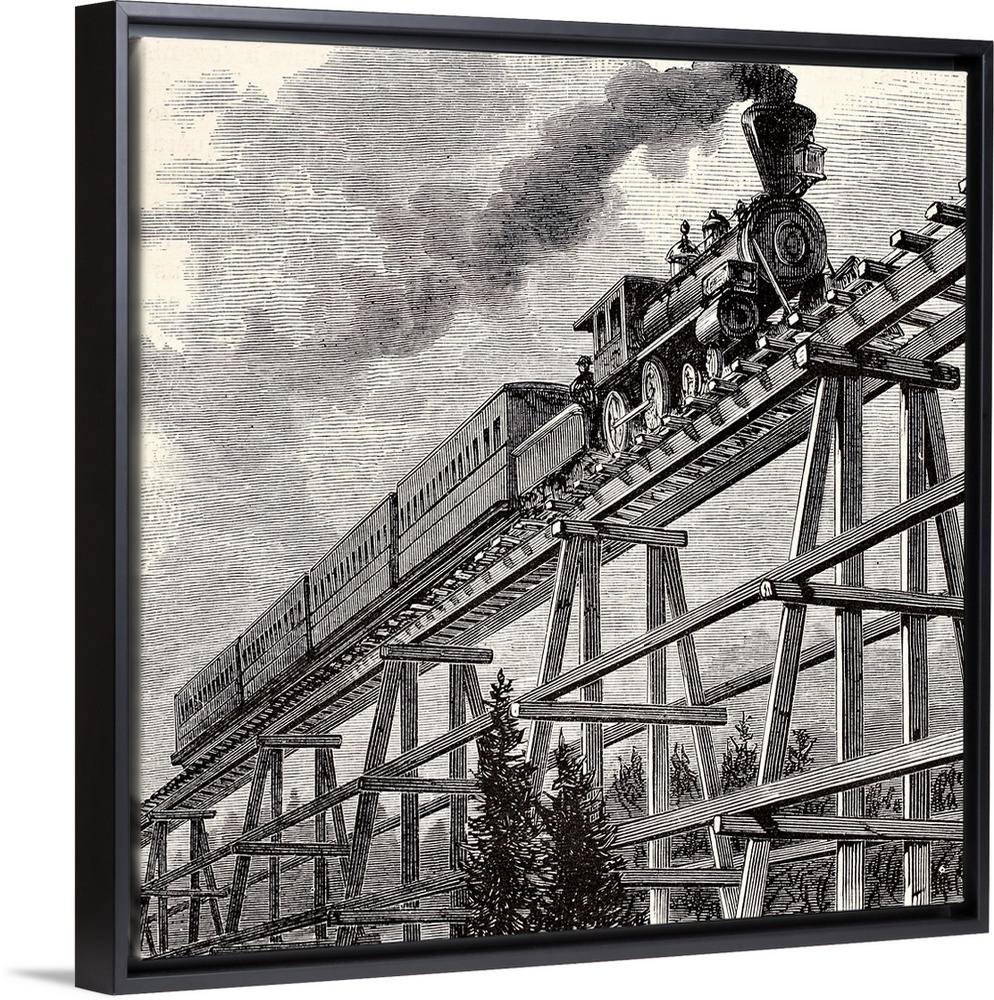 <p>Old illustration of train crossing wooden trestle bridge along Union Pacific railroad. Original, cre</p>