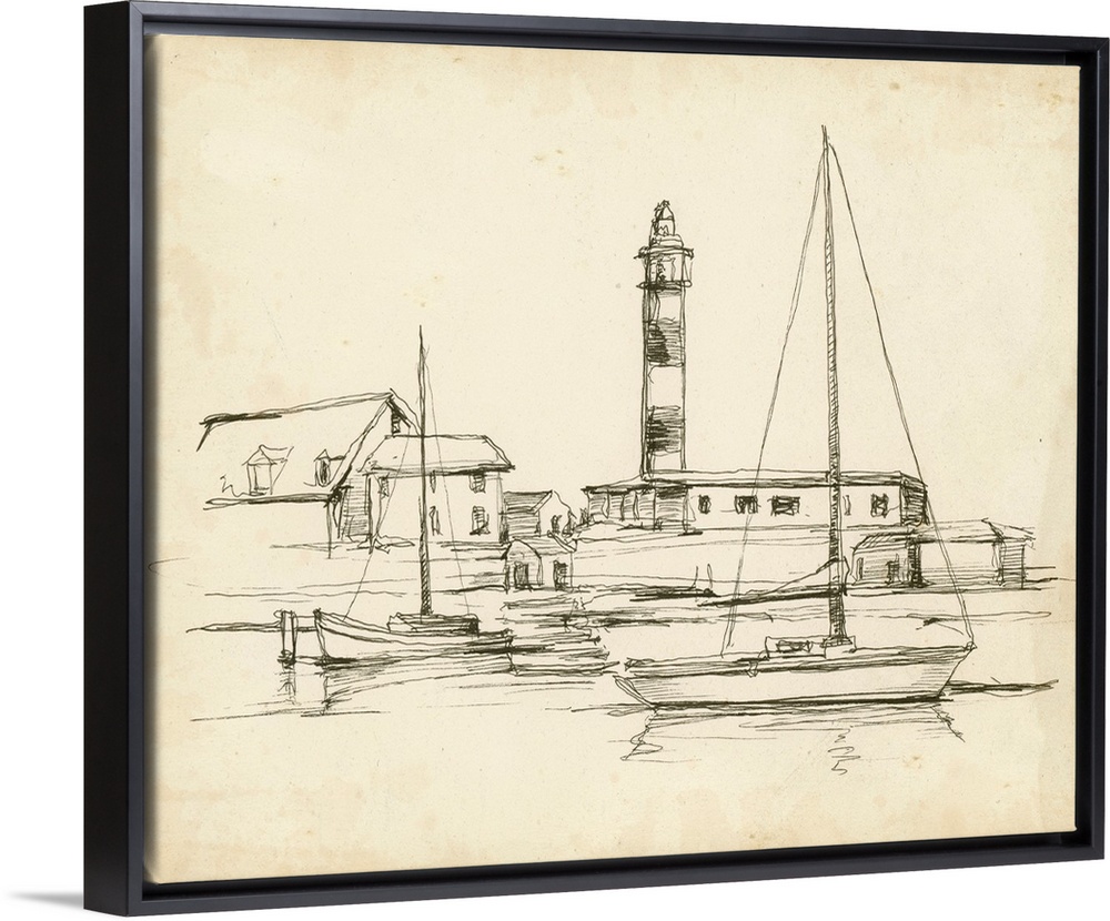 Art Coastal Decorative Art Drawing Ethan Harper Landscapes Harbor Lighthouse Transportation Boat