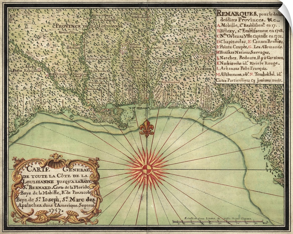 <p>Carte General de Toute la Cte de la Louisianne Jusqu'a la Baye St. Bernard, Coste de la Floride, Baye de la Mobille, Be. de Pansacole, Baye de St. Ioseph, St. Marc des Apalaches. dans l'Amerique Septentle.</p>