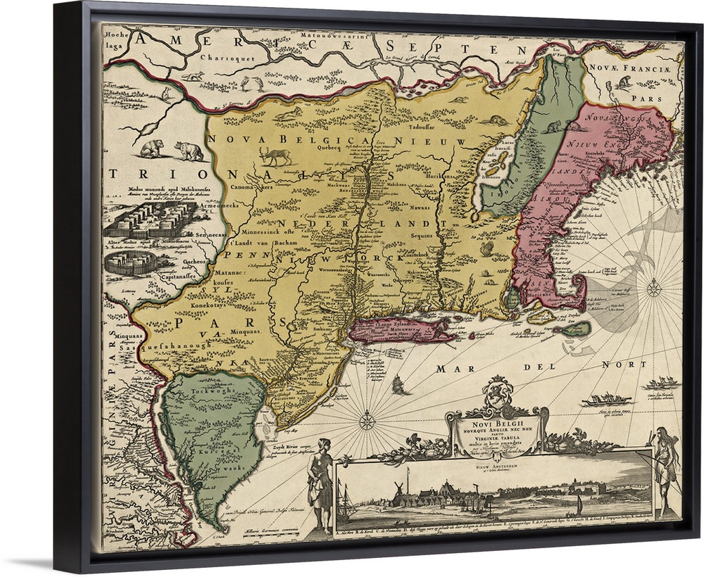 <p>Shows the eastern coast of the US from the Chesapeake Bay north to Maine. The Dutch colony is shown in yellow, the British colony of New England in pink, and other regions in green whose borders were in a state of change in the late 17th century (present-day Vermont in the north, and Delaware and the eastern shore of Maryland in the south). At the bottom right is the often copied inset view of New Amsterdam (renamed to New York in 1664 by the British) depicting the fort, windmill, and numerous buildings and ships of the Dutch settlement.</p>