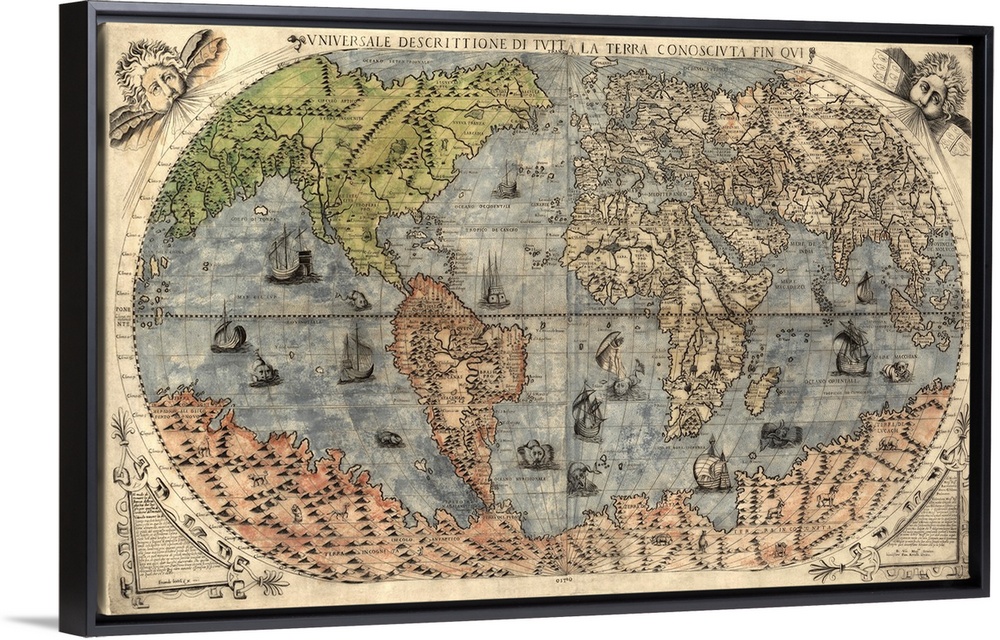 <p>Oversized wall hanging of an antique world map with Italian text on it.</p>