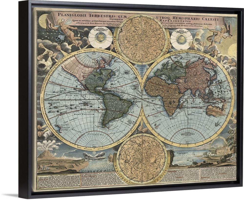 <p>Shows routes of Magellan and other explorers. Includes inset drawings showing the north and south celestial spheres, the position of the sun in summer and winter, and natural events including a volcanic eruption, earthquake, whirlpool, and rainbow. Latin text at bottom accompanies the drawings of natural events.</p>