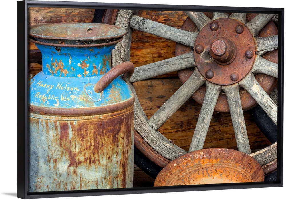 <p>USA, Alaska. Antique milk can, wagon wheel and gold pan.</p>
