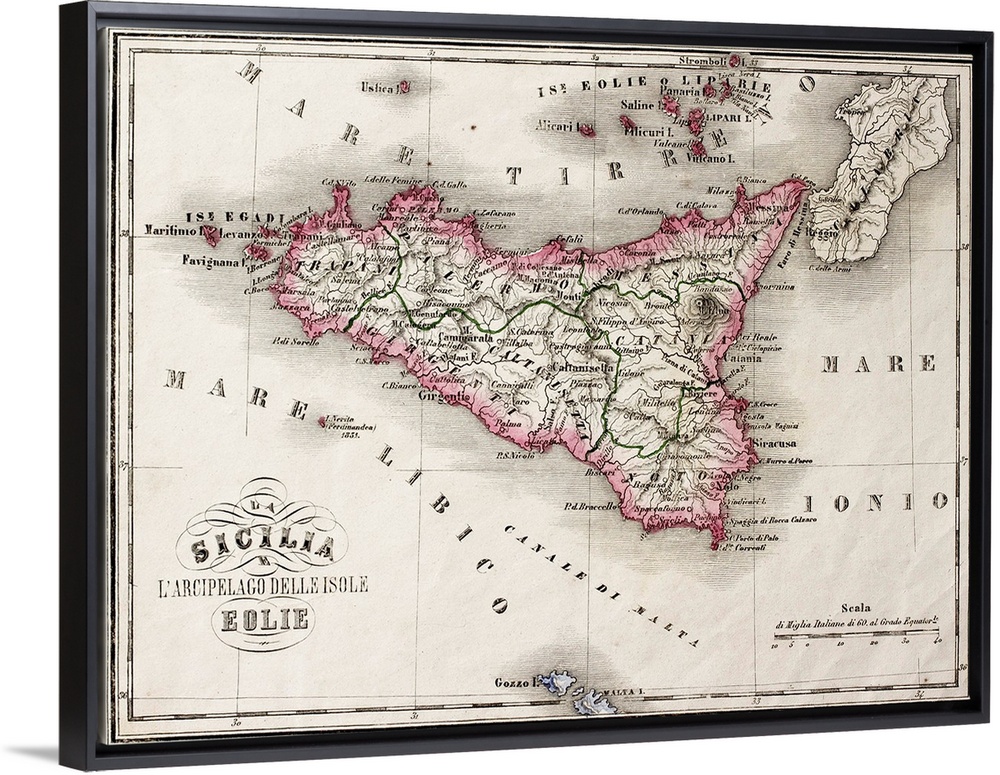 <p>An old map of Sicily and little islands around it. The original map was published in Italy in 1860,</p>
