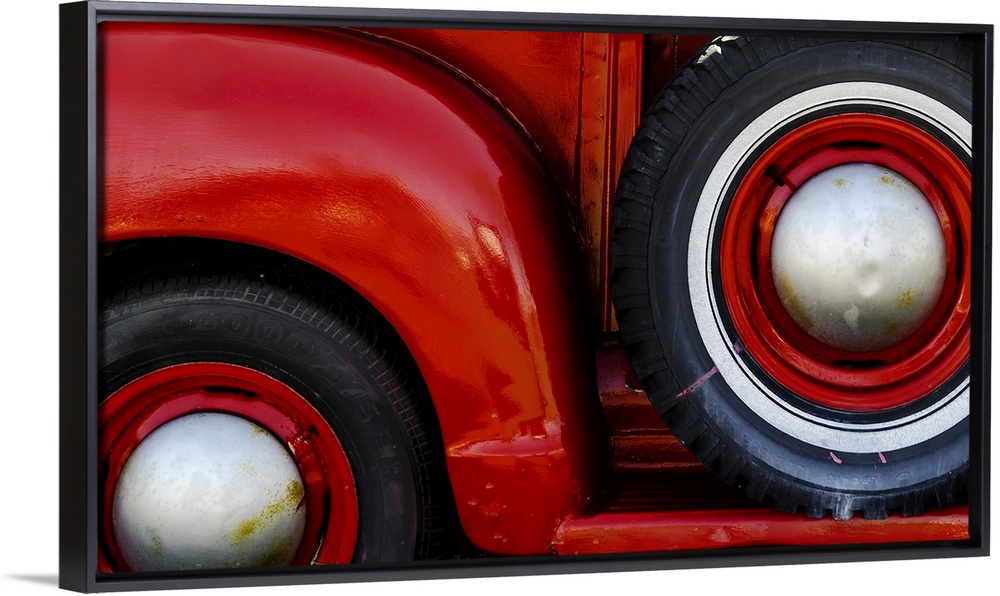 <p>Abstract geometric image formed by the juxtaposition of curving fenders and round tires with muted hubcaps on a bright red antique pickup truck.</p>