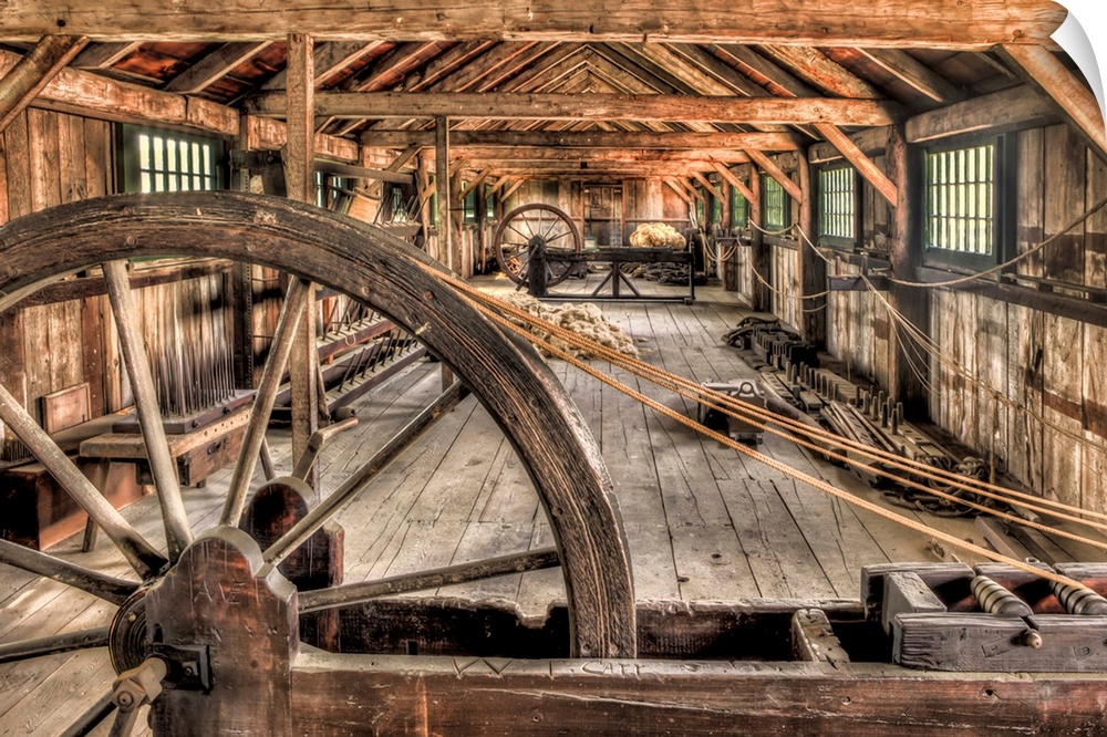 <p>The interior of an old rope factory, with large wooden wheels.</p>