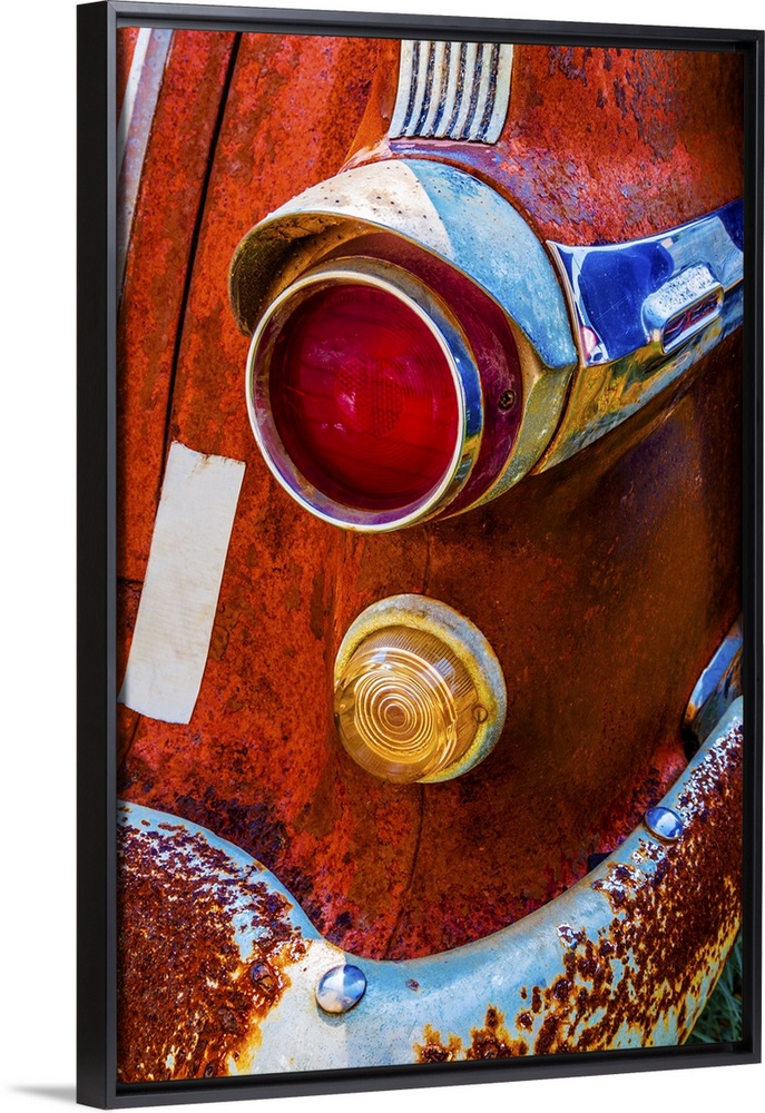 <p>A vivid surrealistic rusty red antique Pontiac tail light section with red and yellow lenses and blue reflections in its chrome bumper and trim.</p>