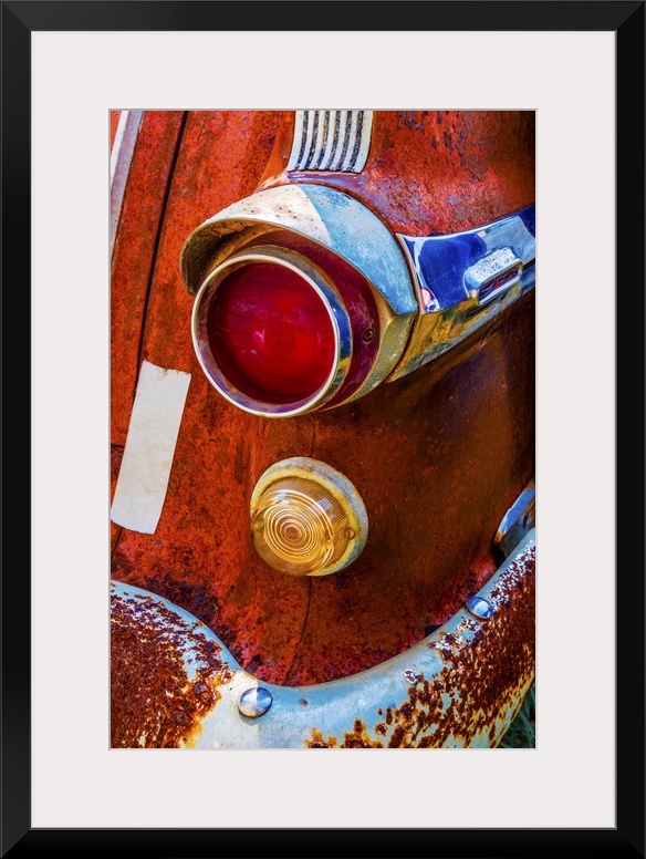 <p>A vivid surrealistic rusty red antique Pontiac tail light section with red and yellow lenses and blue reflections in its chrome bumper and trim.</p>