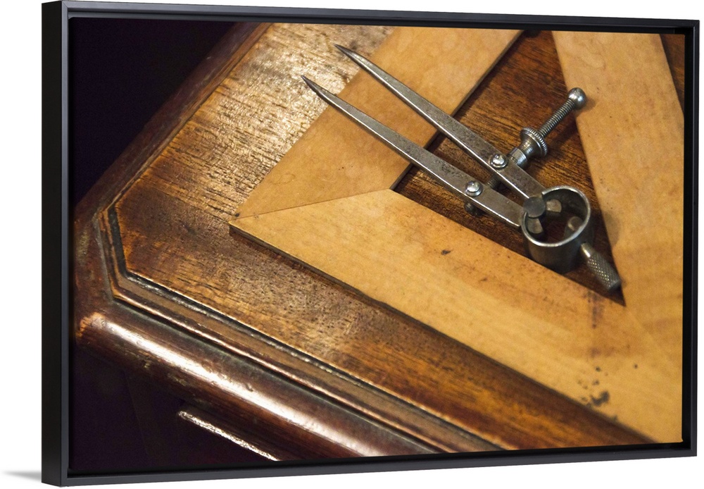 <p>Antique set square and pair of compasses on wooden table</p>