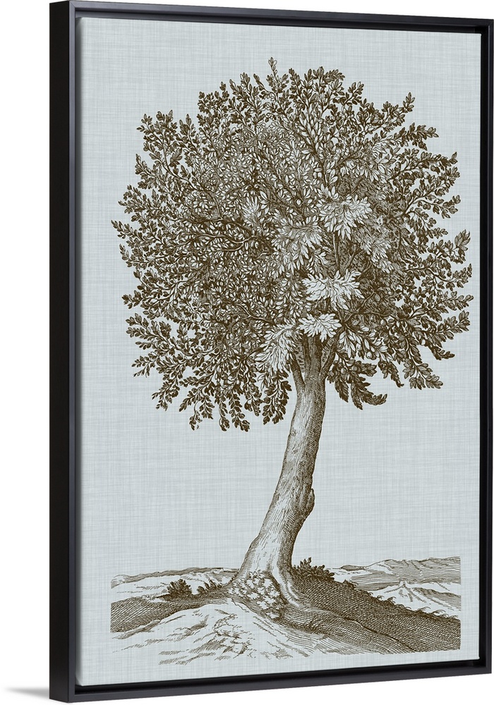 <p>This decorative artwork features an illustrative tree in sepia over a soft blue linen patterned background.</p>