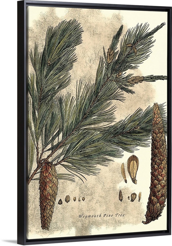 <p>Vintage stylized illustration of a tree branch with pine cones hanging from it.</p>