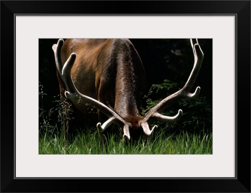 <p>Antlers sheathed in summer velvet, a mature bull wapiti (Cervus elaphus) grazes near the Gibbon River. By autumn the antlers, shed of their soft skin and sha rply honed, arm the bull for the combat and competition of the mating season. E ach sping, wapitis drop their antlers; new ones grow in by summer's end.</p>