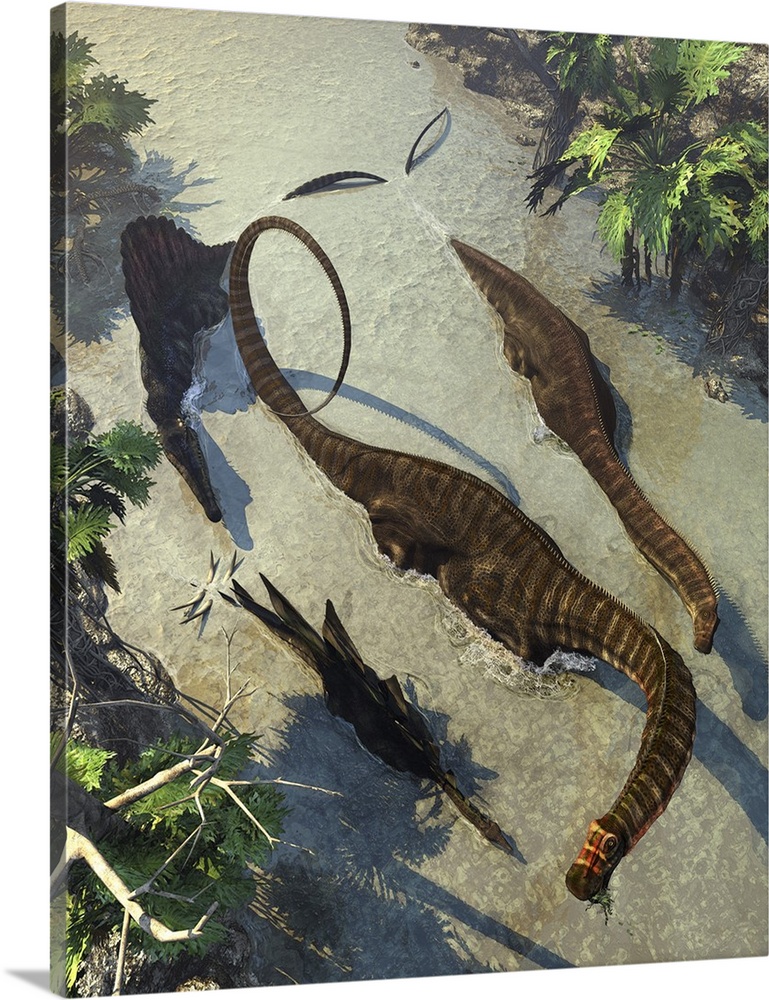 <p>Apatosaurus dinosaurs being chased by a Spinosaurus, who are known to be good swimmers.</p>