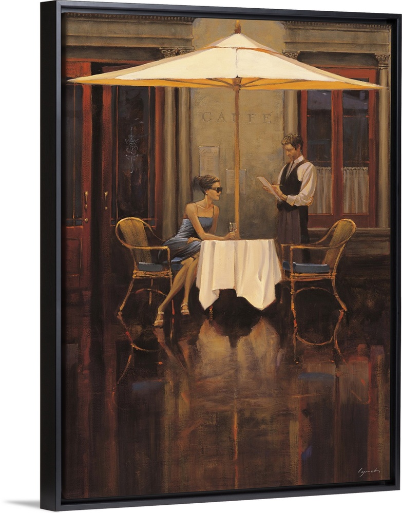 <p>Contemporary painting of a woman sitting at a table outside a bistro looking to her left.</p>