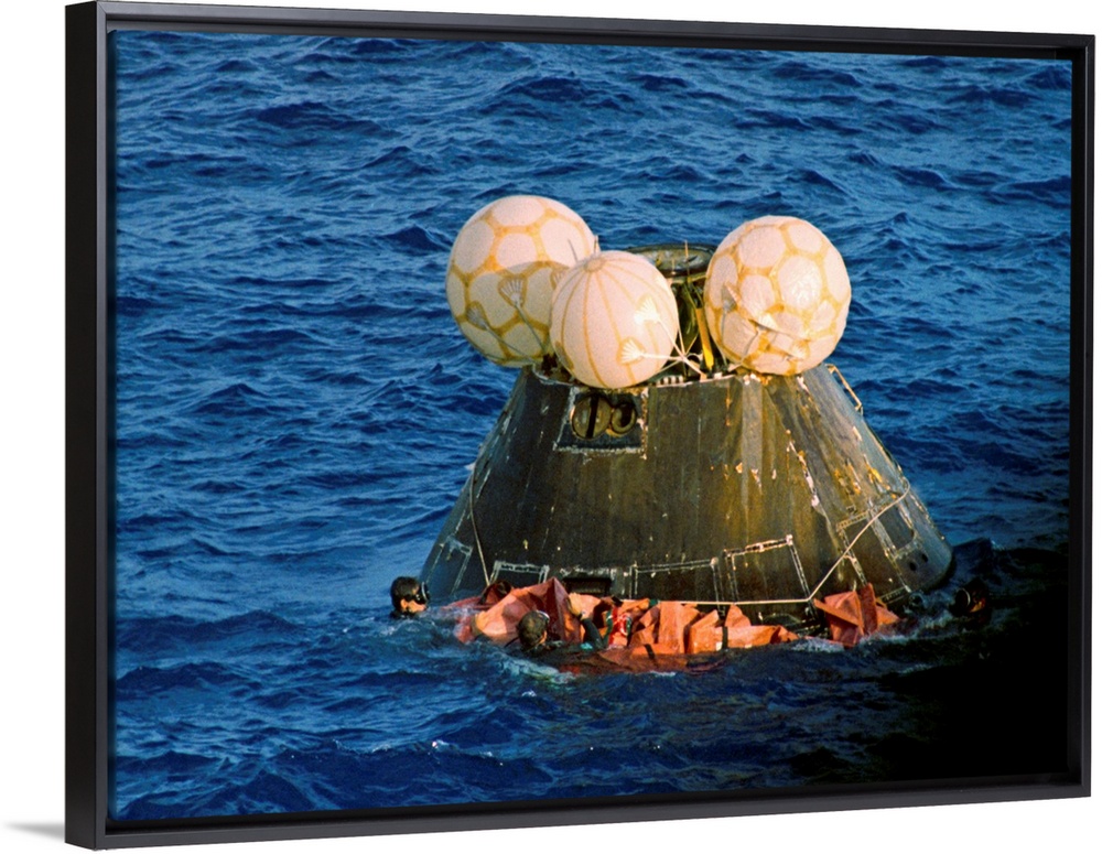 <p>Navy swimmers fasten a floatation collar around the Apollo 13 capsule as it floats after splashdown in the Pacific Ocean. Aboard are James Lovell, John Swigert, and Fred Haise.</p>