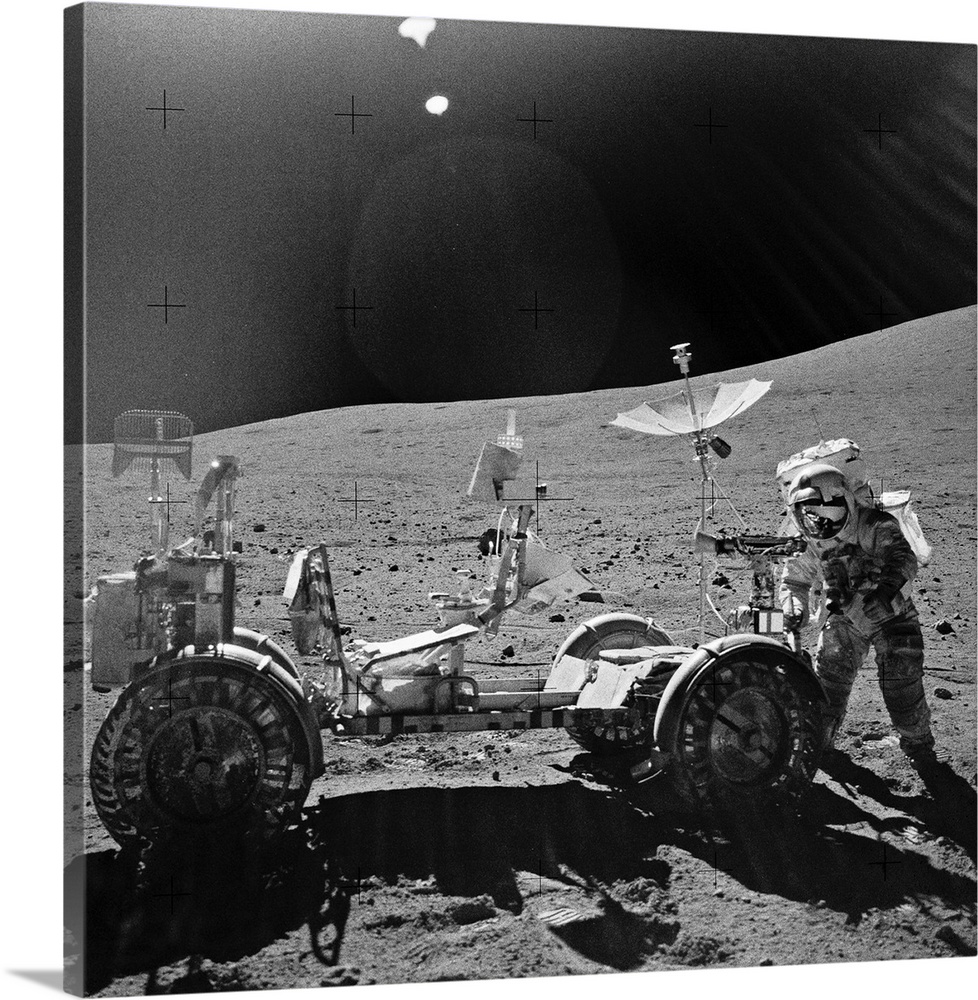 <p>Apollo 16 exploration of the Moon. NASA astronaut with a lunar rover on the surface of the Moon during the Apollo 16 mission in April 1972. Apollo 16 was the fifth and penultimate mission of the US Apollo space program. Apollo 16 launched on 16 April 1972. The lunar module (Orion) landed on the Moon five days later in the Descartes Highlands. The crew conducted three sorties (20 hours and 14 minutes), with this electric lunar roving vehicle allowing them to travel up to 10 kilometres away. The two astronauts exploring the Moon's surface were Charles Duke and John Young. Courtesy of NASA.</p>