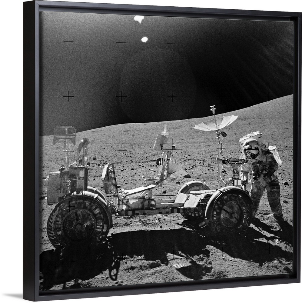 <p>Apollo 16 exploration of the Moon. NASA astronaut with a lunar rover on the surface of the Moon during the Apollo 16 mission in April 1972. Apollo 16 was the fifth and penultimate mission of the US Apollo space program. Apollo 16 launched on 16 April 1972. The lunar module (Orion) landed on the Moon five days later in the Descartes Highlands. The crew conducted three sorties (20 hours and 14 minutes), with this electric lunar roving vehicle allowing them to travel up to 10 kilometres away. The two astronauts exploring the Moon's surface were Charles Duke and John Young. Courtesy of NASA.</p>