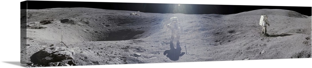 <p>Apollo 16 exploration of the Moon, April 1972. Panoramic montage view of a NASA astronaut on the surface of the Moon during the Apollo 16 mission in April 1972. The astronaut appears twice in the montage because he moved as the photographs were being taken. Apollo 16 was the fifth and penultimate mission of the US Apollo space program. Apollo 16 launched on 16 April 1972. The lunar module (Orion) landed on the Moon five days later in the Descartes Highlands. The crew conducted three sorties (20 hours and 14 minutes) with the electric lunar roving vehicle (in background at upper left), travelling up to 10 kilometres away. The two astronauts exploring the Moon's surface were Charles Duke (seen here) and John Young (taking the photographs). Photographed on 21 April 1972.</p>