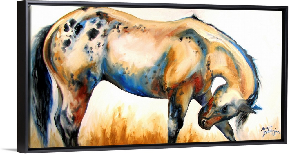 <p>Contemporary painting of an Appaloosa horse bowing in shades of orange, red, black, and blue.</p>