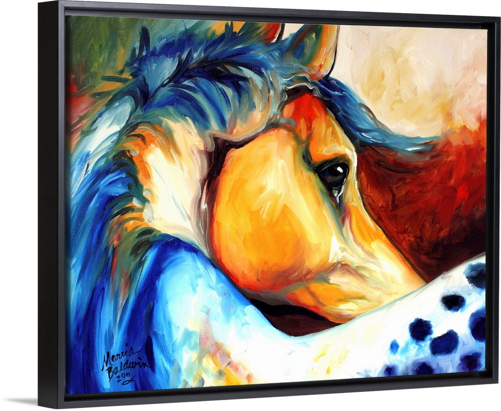 <p>Contemporary painting of a colorful curved Appaloosa horse.</p>