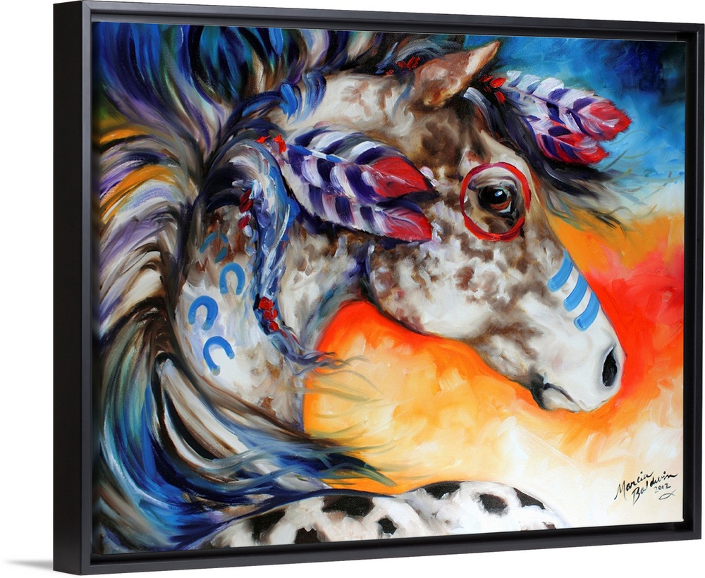 <p>Contemporary painting of an Appaloosa Indian War Horse with blue and red body paint and feathers in its mane on a colorful abstract background.</p>
