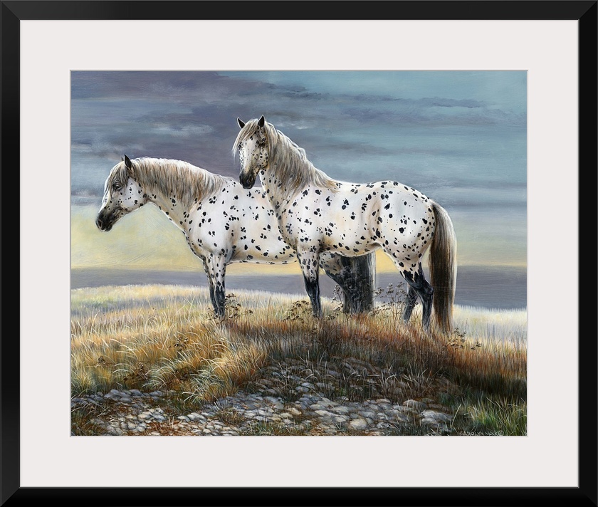 <p>Contemporary painting of two spotted horses standing on a countryside hill.</p>