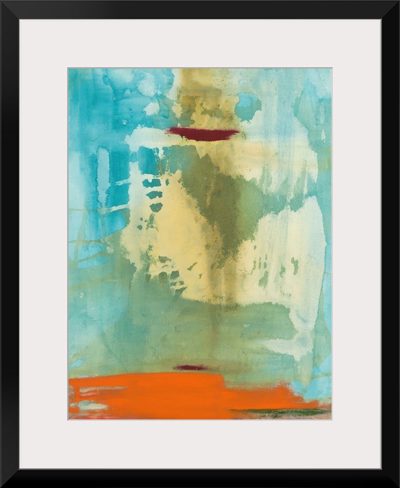 <p>Large abstract painting with a blue background and a yellow overlay with orange and green at the bottom and a small deep red mark towards the top.</p>