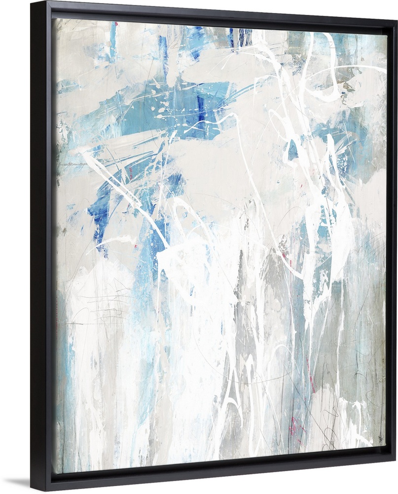 <p>Large abstract painting in shades of blue, beige, gray, and white.</p>